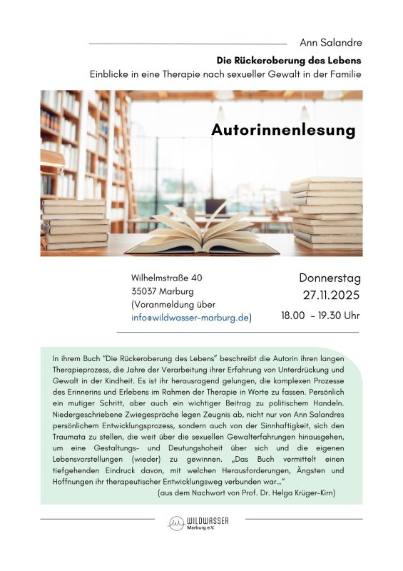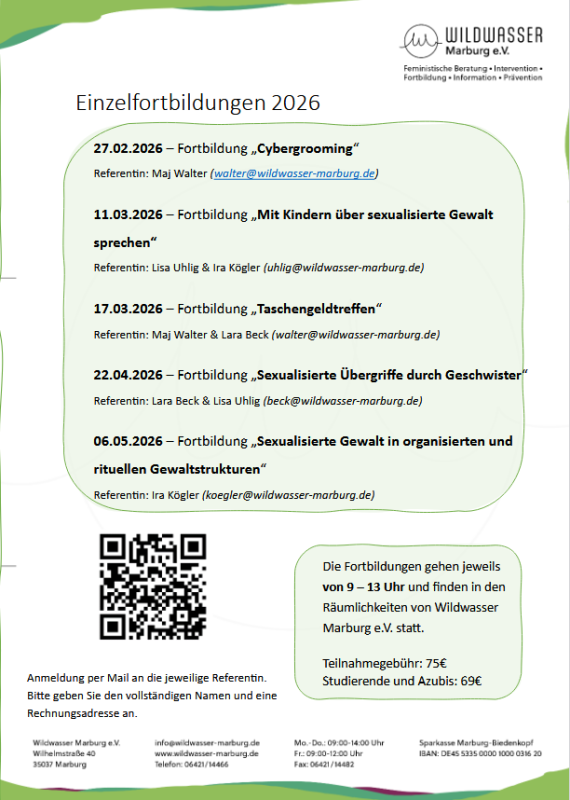 Wildwasser Marburg e.V. ist ein gemeinnütziger Verein, der die Fachberatungsstelle zu sexualisierter Gewalt in Kindheit und Jugend unterhält. Wir bieten Beratung für Personen, die sexualisierte Gewalt in der Kindheit oder Jugend erfahren haben. Auch alle Ratsuchenden, die betroffene Kinder, Jugendliche und Erwachsene unterstützen wollen oder Fragen zum Thema haben, können bei uns Hilfe bekommen